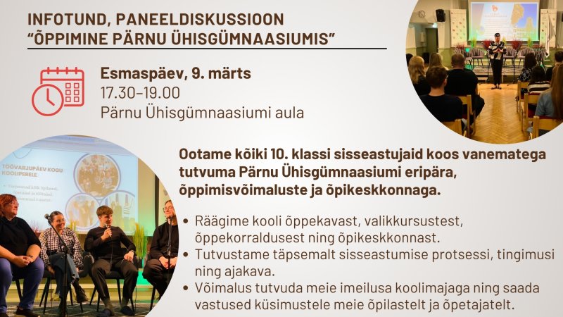 Kutsume kõiki 9. klassi lõpetajaid ja lapsevanemaid esmaspäeval, 9. märtsil 17.30–19.00 kooli aulasse infotund, paneeldiskussioonile "Õppimine Pärnu Ühisgümnaasiumis".