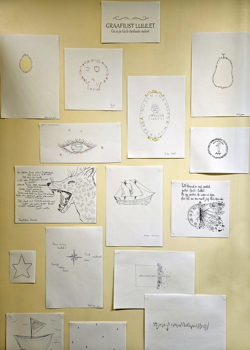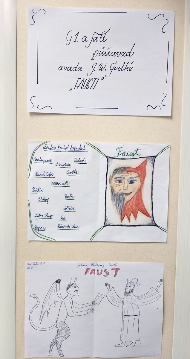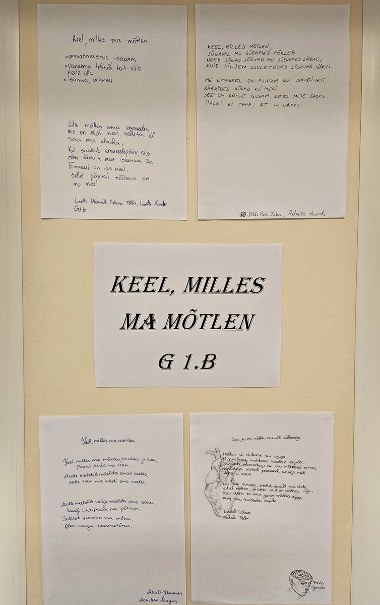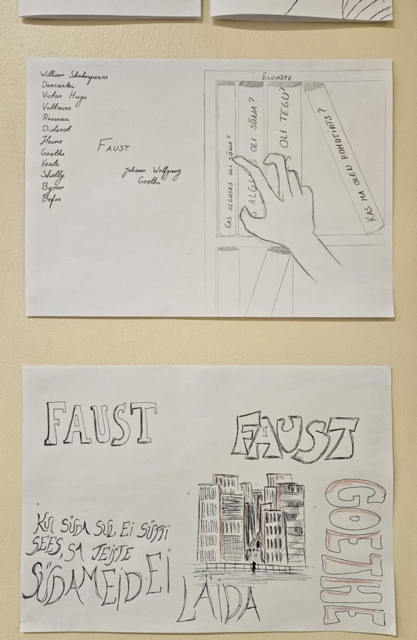 Emakeelepäeva puhul on raamatukogus üleval ka eesti keele ja kirjanduse tundides loodud loovtööd.