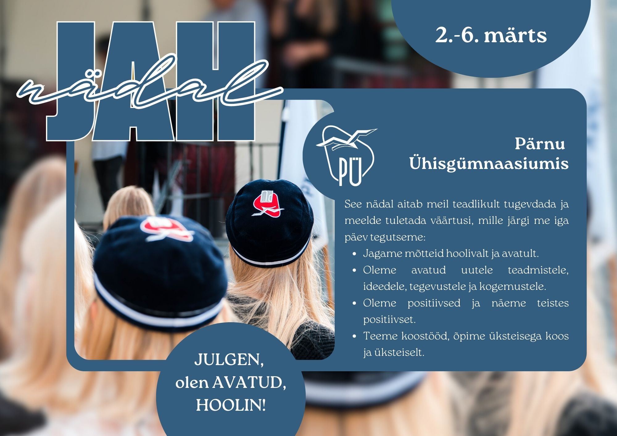 ☀️Pärast koolivaheaega, 2.-6. märtsil toimub Pärnu Ühisgümnaasiumis "JAH-nädal," mille eesmärgiks on veelgi rohkem keskenduda meie kooli väärtustele, olla teineteisega hooliv ning võtta fookusesse mitmed vaimse tervise teemad.