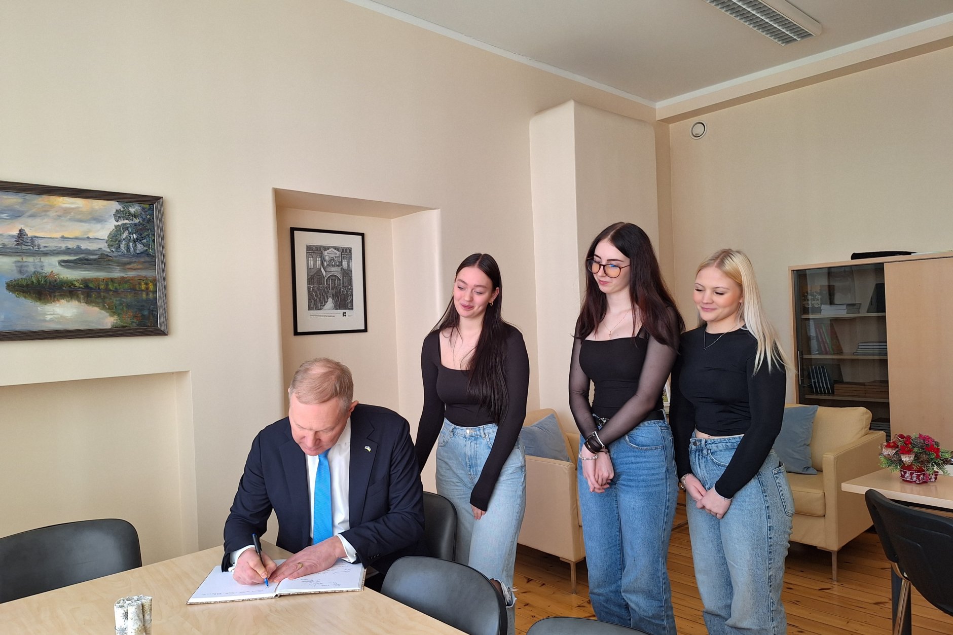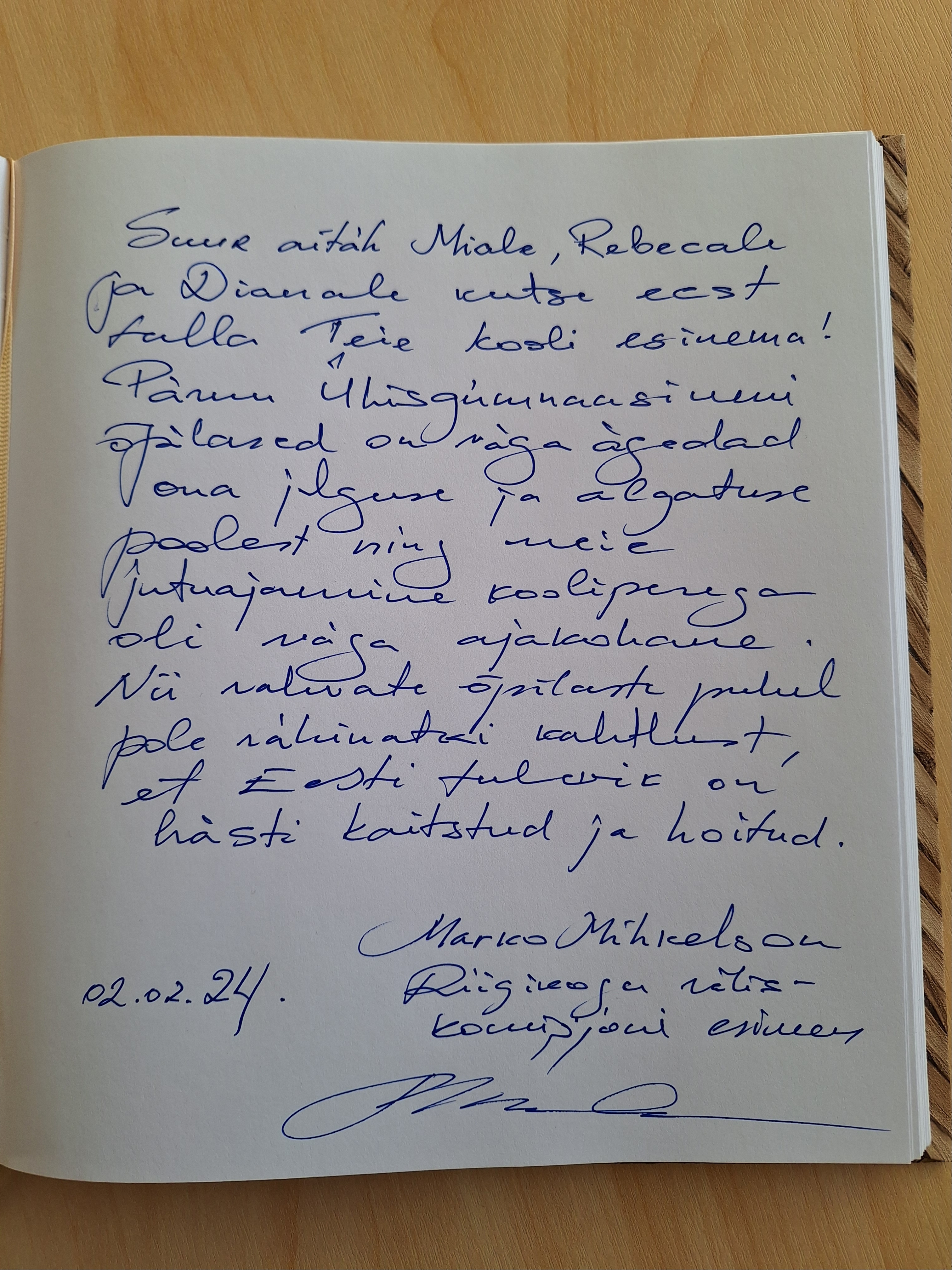 Rahvusvaheliste suhete valikaine tunnis tehtava projekti raames kutsusid G2d klassi tüdrukud Mia Marii, Diana ja Rebeca meile esinema Riigikogu väliskomisjoni esimehe Marko Mihkelsoni. Külaline ei suutnud varjata rõõmsat üllatust, et esimest korda Riigikogus oldud 20 aastat jooksul kutsusid õpilased teda kooli. Esinemise peateemaks oli loomulikult praegune olukord Ukrainas. Marko Mihkelson alustas ajaloolasele kohaselt Tartu rahust, mis sõlmiti just 2.veebruaril 104 aastat tagasi. Oli väga huvitav! Kõlama jäi mõte - hea haridus võimaldab kriitiliselt hinnata meie ümber toimuvat.