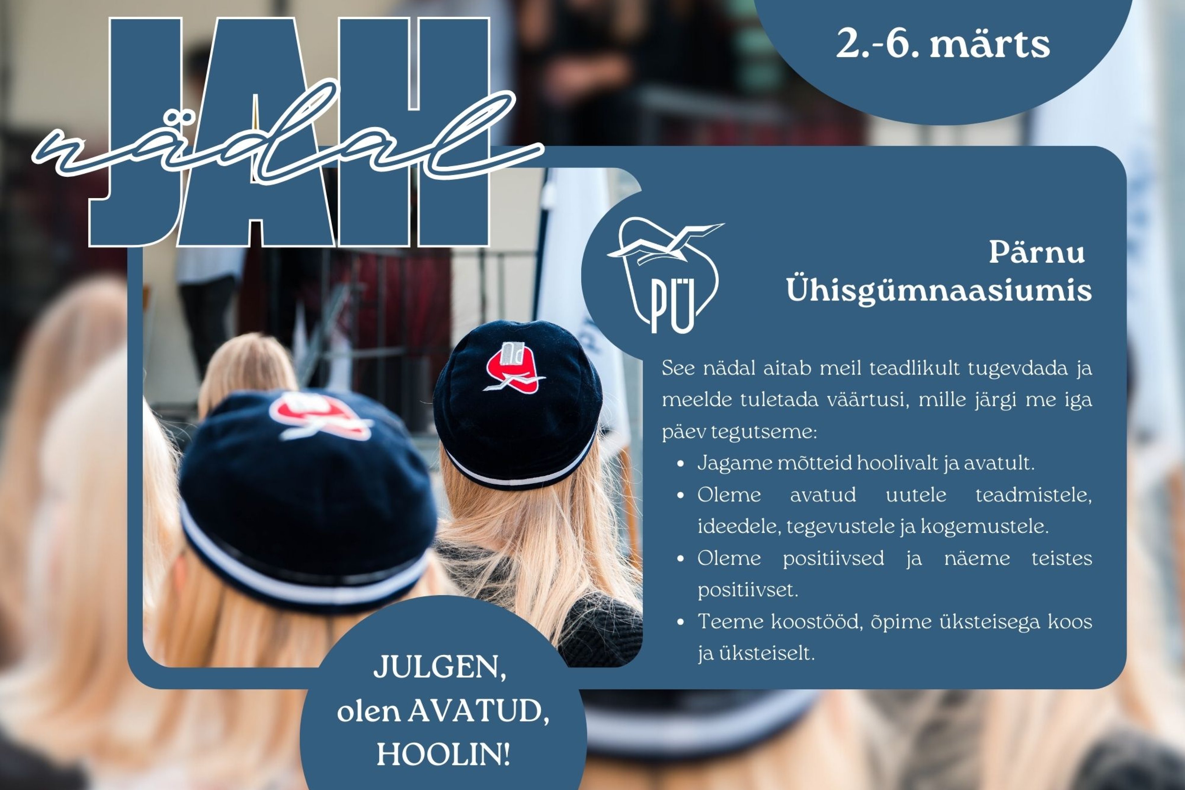 ☀️Pärast koolivaheaega, 2.-6. märtsil toimub Pärnu Ühisgümnaasiumis "JAH-nädal," mille eesmärgiks on veelgi rohkem keskenduda meie kooli väärtustele, olla teineteisega hooliv ning võtta fookusesse mitmed vaimse tervise teemad.