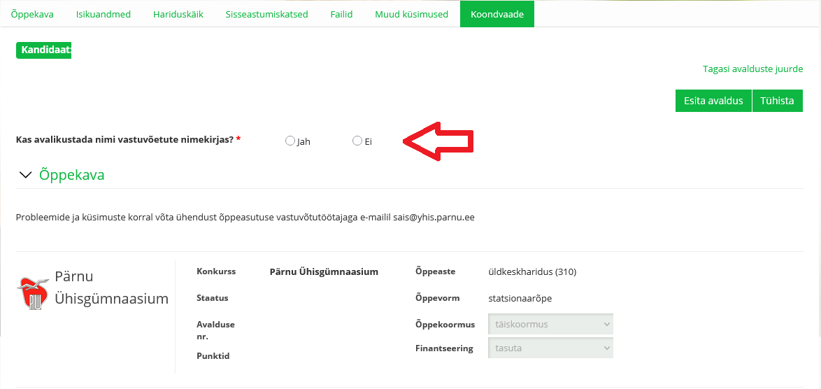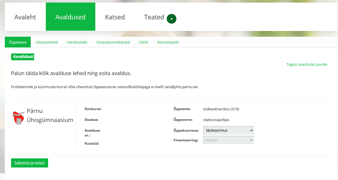 Probleemide ja küsimuste korral võta ühendust kooli vastuvõtutöötajaga e-mailil sais@yhis.parnu.ee
